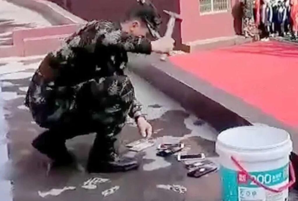 Como una medida para evitar que los estudiantes lleven sus celulares a clases, en China, en el instituto de la provincia de Hunan, dispositivo decomisado, dispositivo destruido