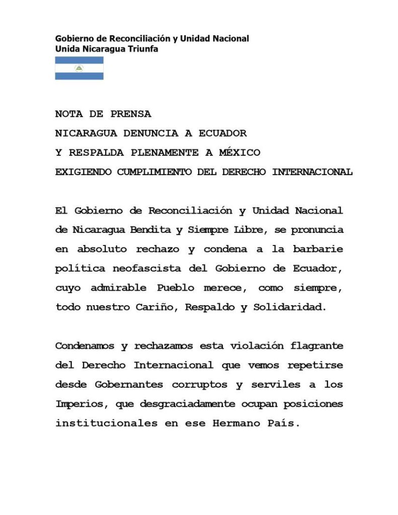 A través del comunicado también dieron a conocer que se formaliza la ruptura de sus relaciones con el país. En 2020 Nicaragua retiró su embajada de Quito- Ecuador. El comunicado concluye solidarizándose con el presidente y Gobierno Mexicano. Las reacciones internacionales continúan ante el accionar del gobierno ecuatoriano al ingresar a la embajada de México […]