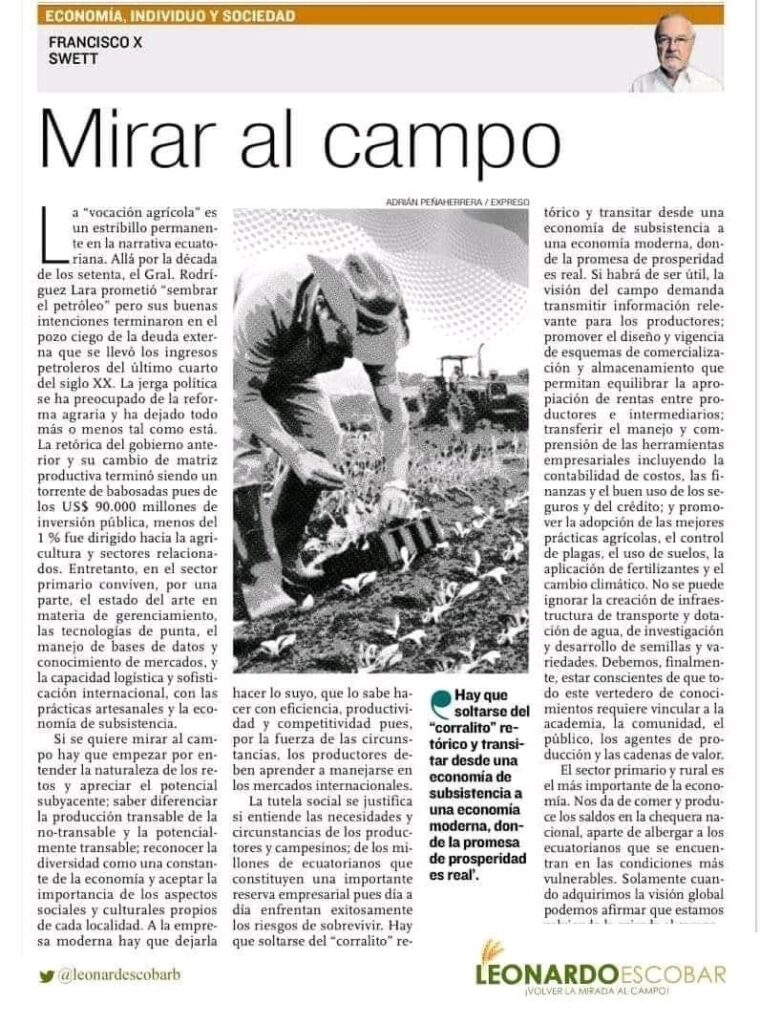 Francisco Swett M. (+)Economista, catedrático, congresista, ministro de Finanzas, presidente de la Junta Monetaria, decano de la UESS, y articulista en medios nacionales e internacionales. Fue un valioso soporte para el Voluntariado Agropecuario y el Foro Agropecuario. Al agro le deja como legado cuatro artículos: “Mirar al Campo I, II, III y IV”, los cuales […]