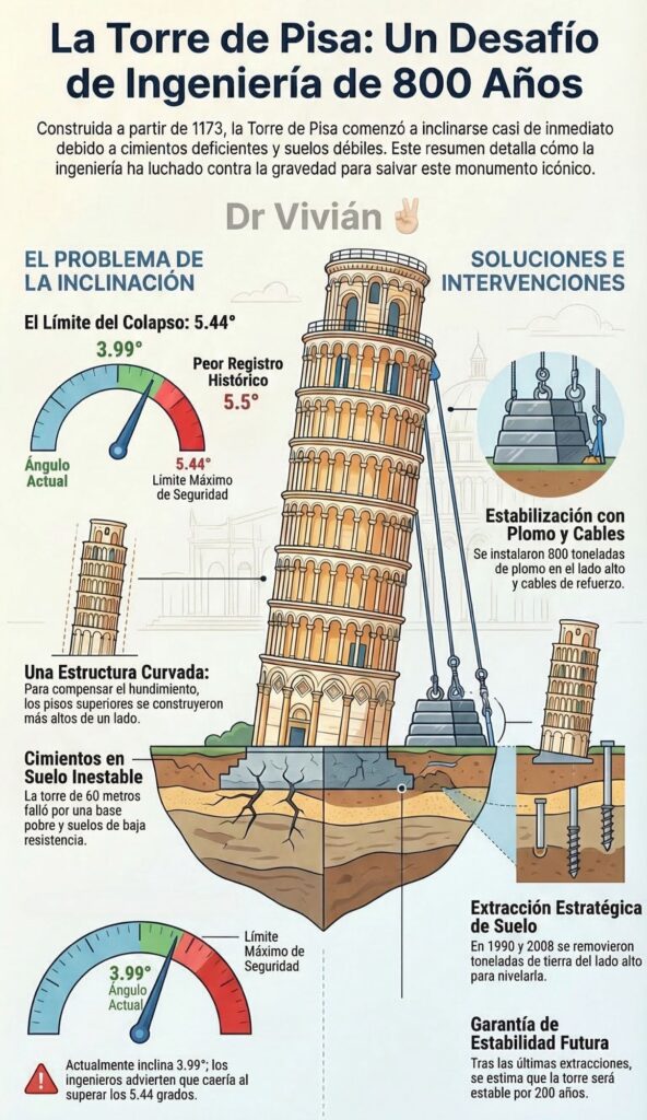 La Torre de Pisa, un rascacielos de 60 m (200 pies) de altura en Italia, fue construida en 1173. Originalmente se diseñó para mantenerse vertical. Sin embargo, debido a una cimentación deficiente y a la mala calidad del suelo, la torre comenzó a inclinarse y asentarse poco después de iniciarse su construcción.