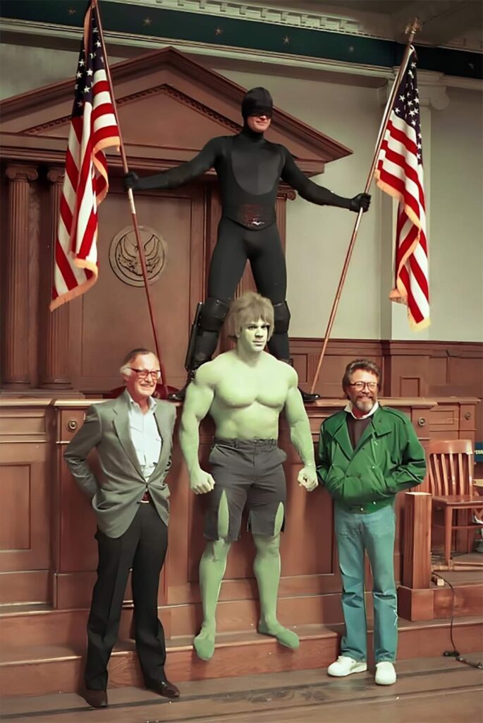 Escena icónica donde David tiene una pesadilla sobre su próximo juicio y sueña con transformarse en Hulk en pleno estrado de los testigos.El escritor, editor y empresario de cómics Stan Lee junto a los actores Lou Ferrigno, Bill Bixby y Rex Smith (Daredevil) miembros del elenco “EL INCREÍBLE HULK”. Película especial para NBC, “Trial of […]