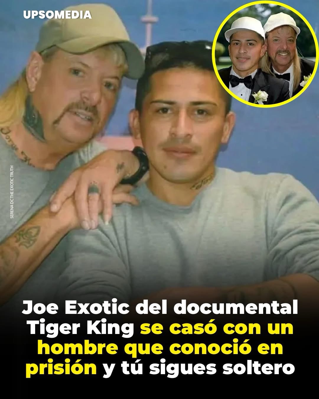 Exotic, famoso desde el documental de Netflix de 2020 y condenado en 2019 a 21 años de prisión por intentar contratar hombres a sueldo contra Carole Baskin, celebró su tercer matrimonio entre rejas. La pareja se conoció en prisión, donde Jorge cumplía pena por asuntos migratorios. “Conozcan a mi esposo”, escribió Joe, feliz con traje y gorra blanca a juego.