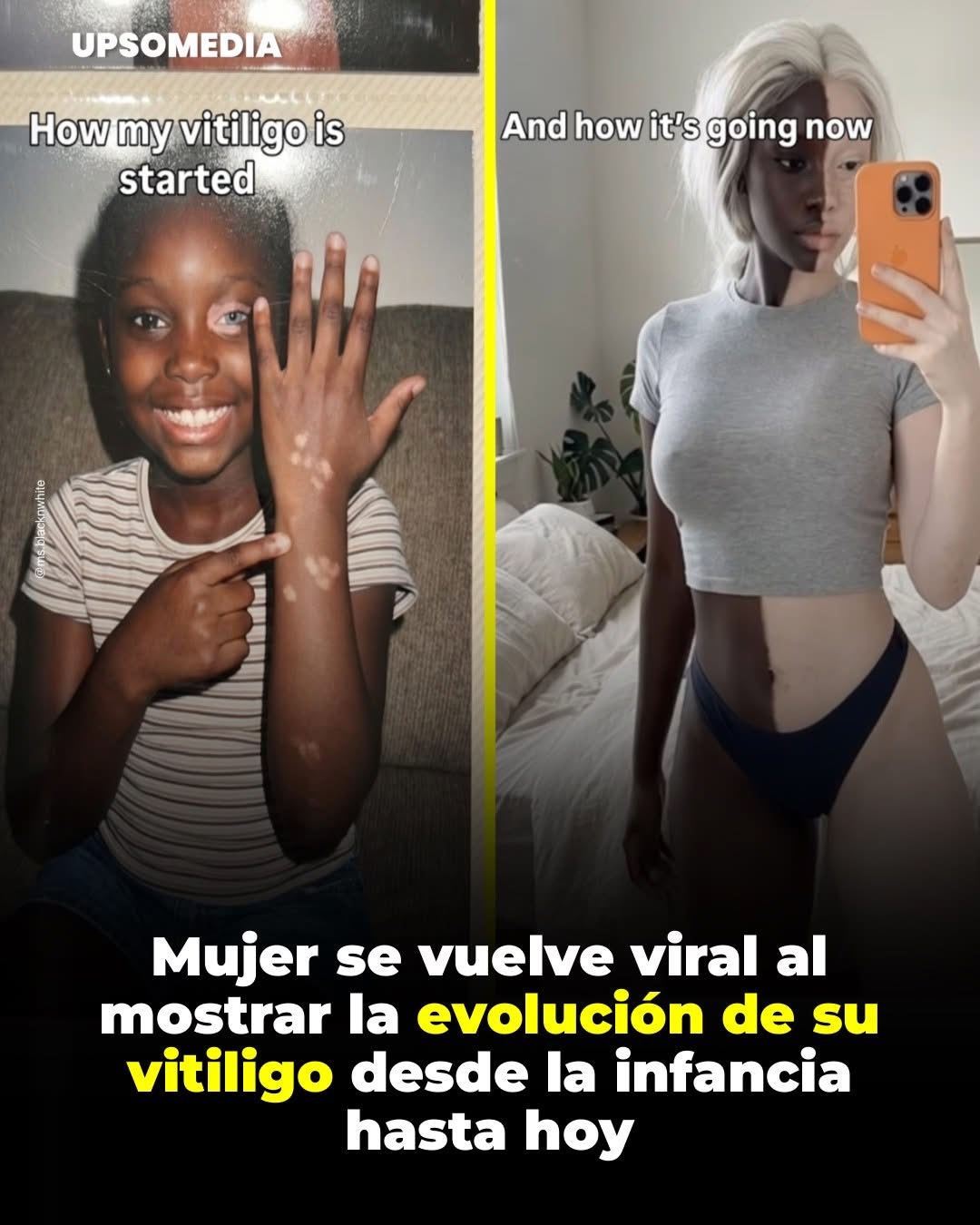 Trisha, más conocida como @ms.blacknwhite en su Instagram, se volvió viral tras compartir imágenes que muestran la evolución de su vitiligo a lo largo de los años. En las fotografías se puede ver desde su infancia, cuando comenzaron a aparecer las primeras zonas despigmentadas en la piel, hasta la actualidad, donde se muestra con seguridad y sin ocultar ninguna parte de su cuerpo.